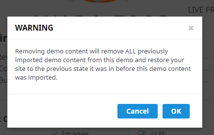 이 데모에서 이전에 임포트한 모든 데모를 제거하고 사이트를 이 데모가 임포트되기 전 이전 상태로 되돌린다는 경고입니다. 혹시 모르니 가능한 경우 사이트 백업을 받아놓으면 안전합니다. OK를 클릭하면 데모가 삭제됩니다. 데모가 삭제된 후에 다른 데모를 설치할 수 있습니다.