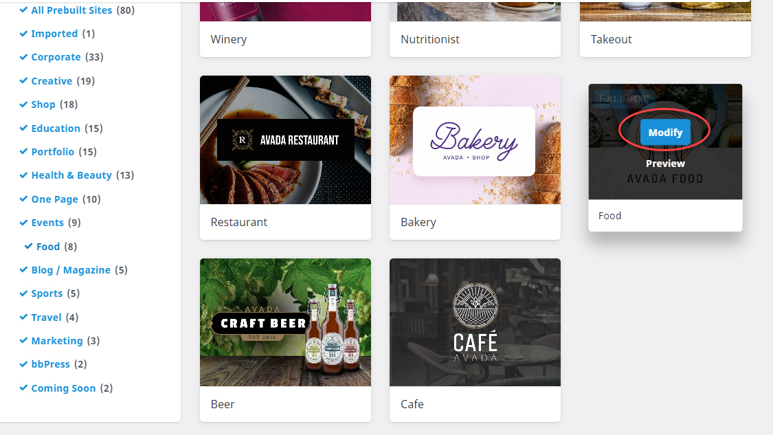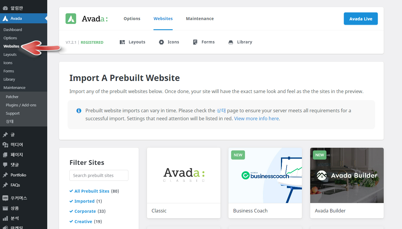 아바다 테마에서 데모를 제거하려는 경우 Avada > Websites로 이동합니다.