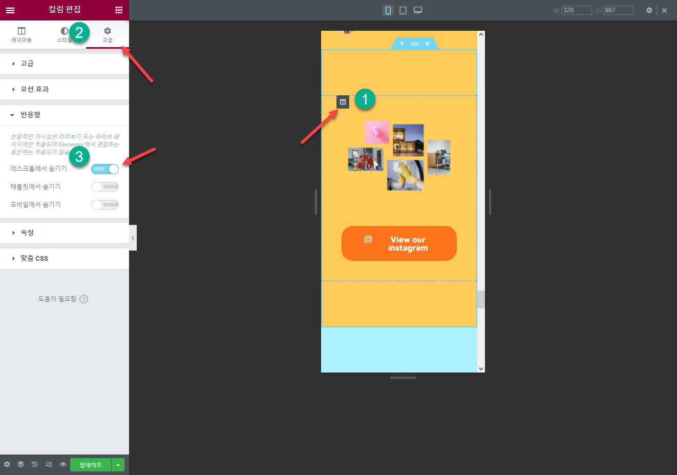 동일한 방법으로 데스크톱용 레이아웃에서는 모바일에서 숨기기와 태블릿에서 숨기기를 활성화해주면 모바일과 PC에서 각각 다른 섹션이 표시됩니다.