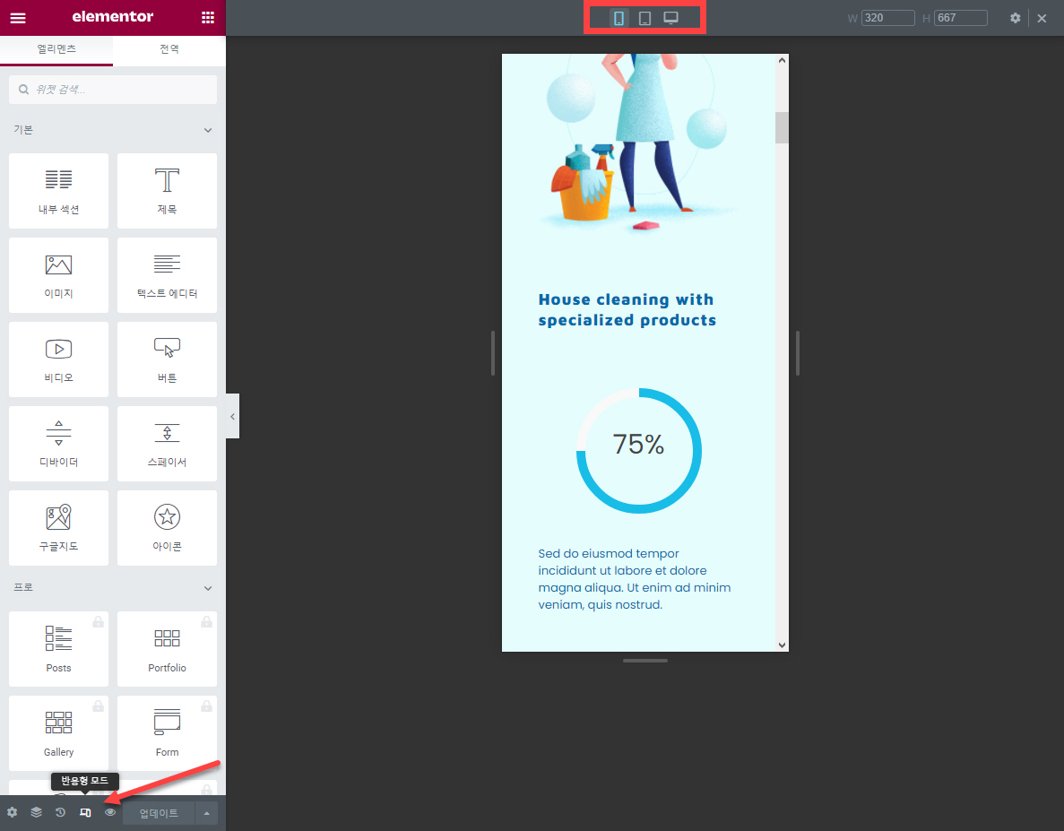 엘리멘토 페이지 빌더로 사이트를 만들면 반응형으로 작동합니다. 모바일 기기 레이아웃을 변경하고 싶다면 하단의 '반영형 모드' 아이콘을 클릭하도록 합니다. 그러면 상단에 기기 해상도를 선택할 수 있는 3개의 아이콘이 표시됩니다: 모바일, 태블릿, PC.