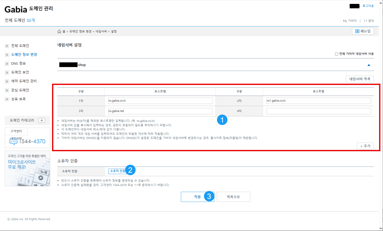 새로운 네임서버 정보를 입력했다면 '소유자 인증'(②)을 클릭하여 휴대폰이나 이메일로 소유자 인증을 하도록 합니다. 소유자 인증이 완료되면 '적용' 버튼(③)을 클릭합니다.