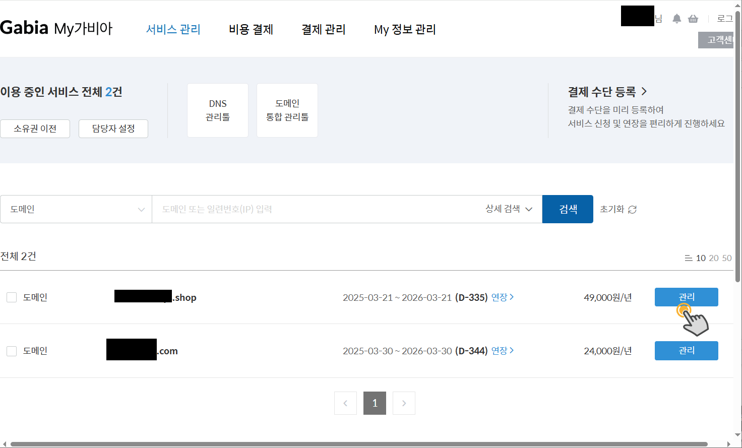3. 도메인 목록이 표시됩니다. 네임서버를 변경할 도메인의 "관리" 버튼을 클릭합니다.