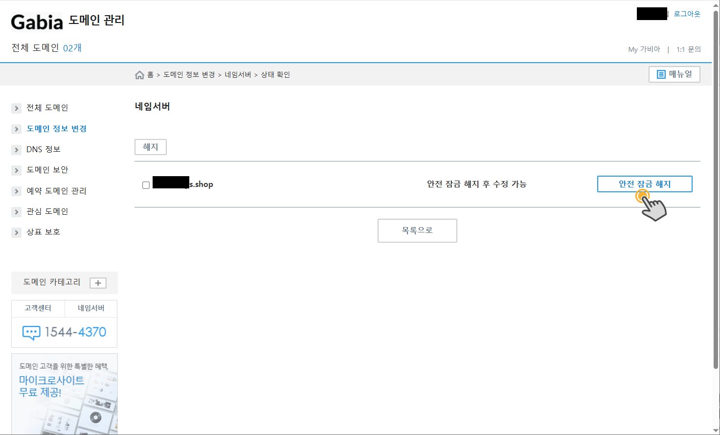 만약 안전 잠금 서비스가 신청되어 있는 경우에는 네임서버 변경이나 기관 이전이 불가능하게 됩니다.