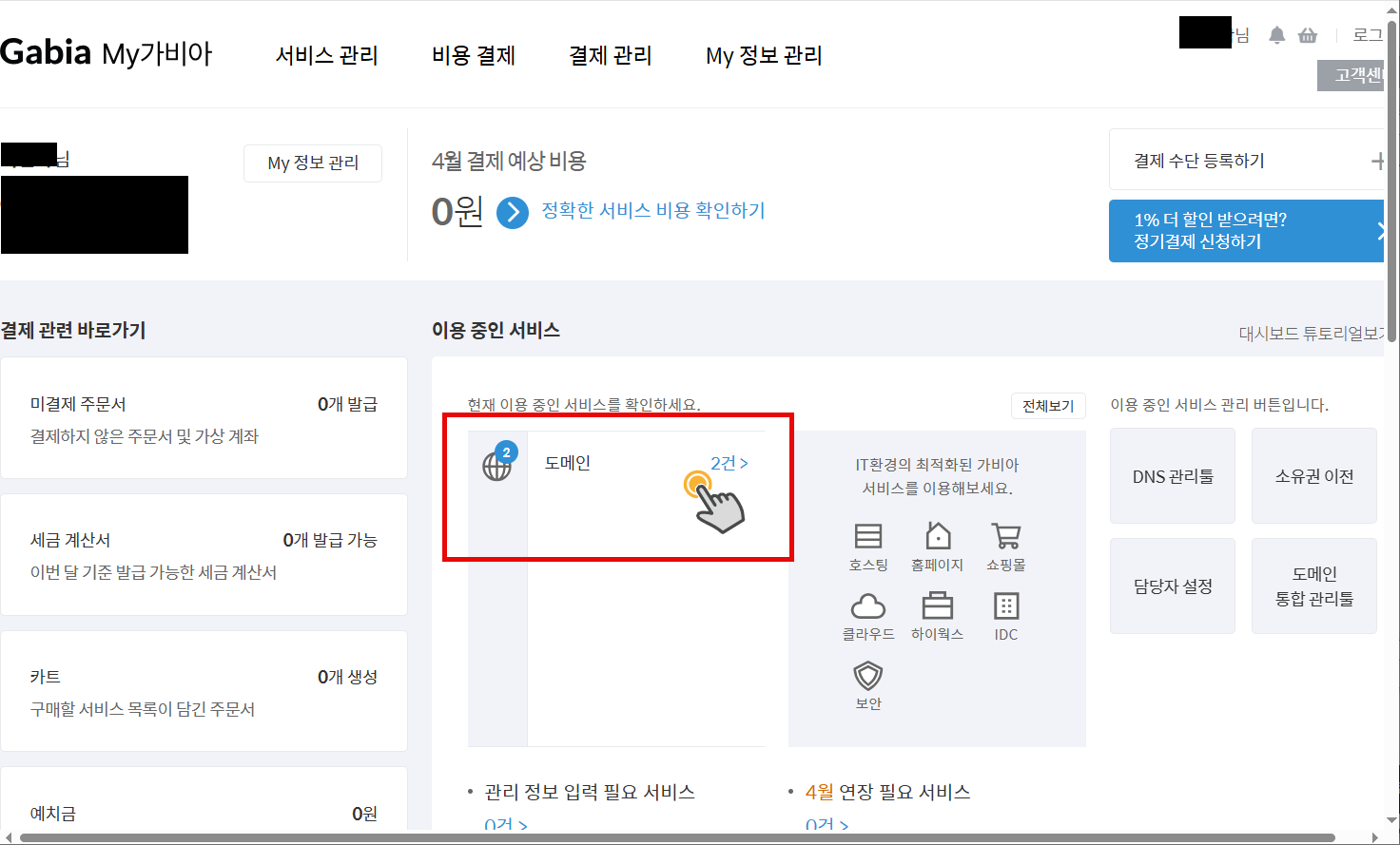 2. My 가비아 화면이 표시되면 이용 중인 서비스에서 도메인 부분을 클릭합니다.