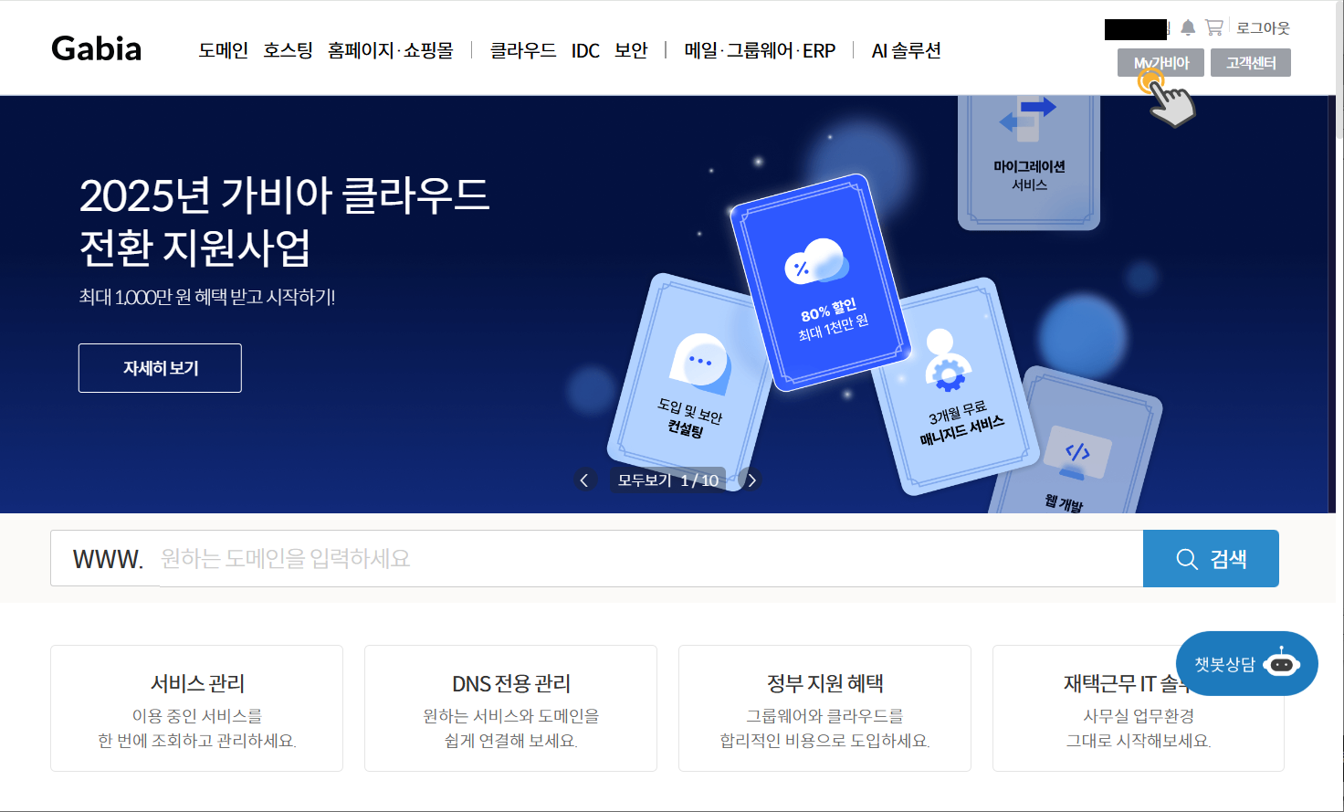 1. 가비아 홈페이지에 접속하여 로그인한 후 My 가비아를 클릭합니다.