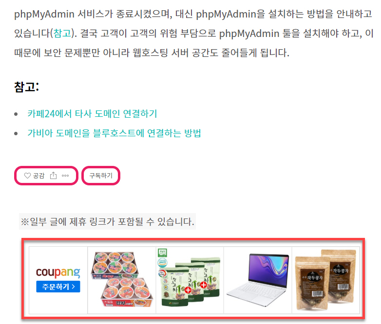이 블로그에 오랫동안 표시했던 구글 애드센스 광고를 제거하고 대신 쿠팡 파트너스 배너를 글 상단과 하단에 표시하도록 조정했습니다.