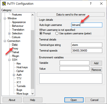 이제 Connection > Data를 클릭하고 Auto-login username(자동 로그인 사용자 이름)에 bitnami를 입력합니다.