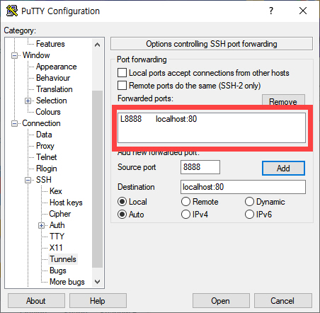 다음으로 Tunnels를 클릭하고 Source port에 8888, Destination에 localhost:80을 입력하고 Add를 클릭합니다.