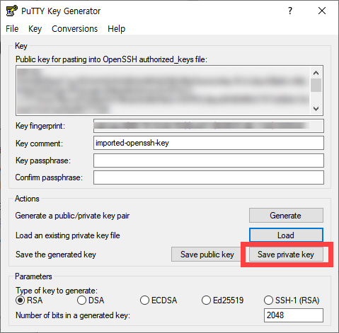 PuTTY Key Generator 프로그램을 실행한 후에 pem 파일을 Load한 후에 Save private key(프라이빗 키 저장)를 눌러 ppk 파일로 저장할 수 있습니다.