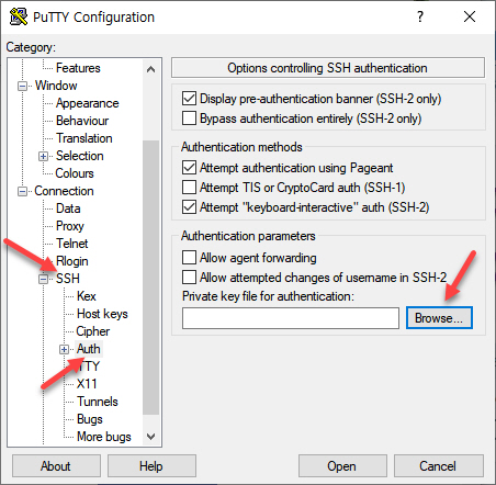 Connection > SSH > Auth로 이동한 후에 Private key file for authentication(인증용 프라이빗 키 파일)에서 Browse...(찾아보기)를 클릭하여 PPK 파일을 지정합니다.