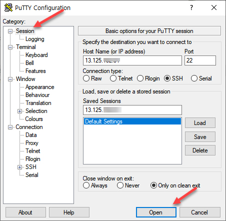 PuTTY 프로그램을 실행한 후에 Host Name (or IP address) 필드에 사이트의 IP 주소를 입력합니다.