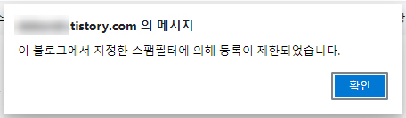 티스토리 '이 블로그에서 지정한 스팸필터에 의해 등록이 제한되었습니다' 오류 메시지