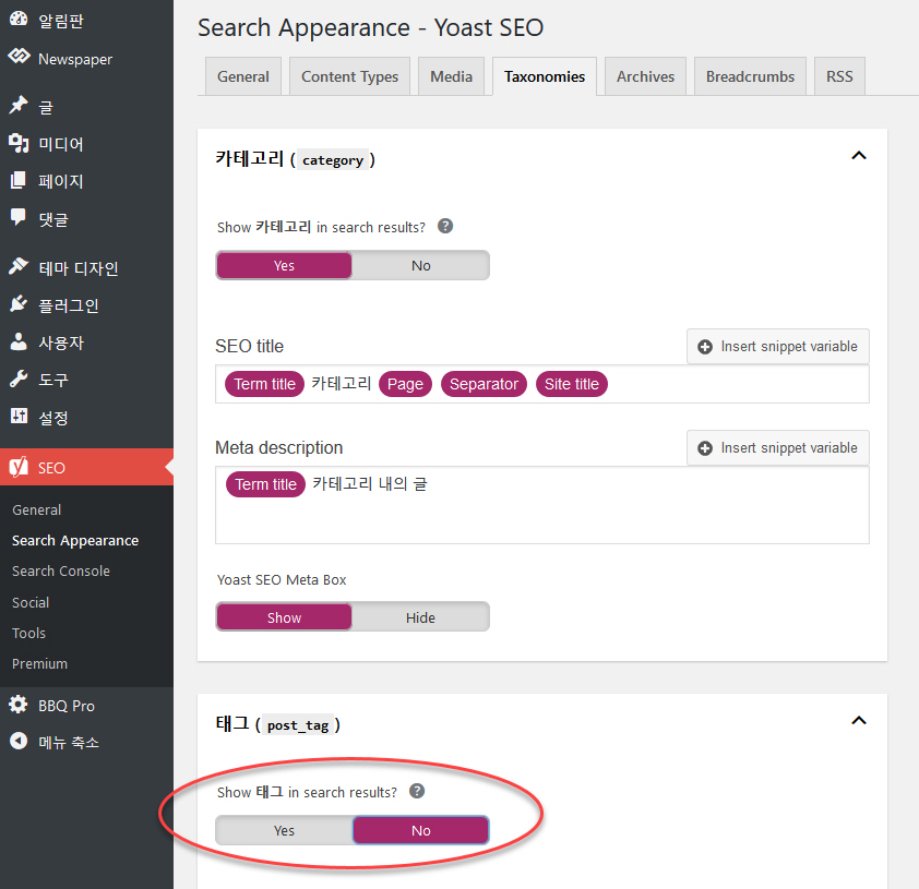 Yoast SEO에서는 워드프레스 알림판 > SEO > Search Appearance > Taxonimies에서 카테고리나 태그 페이지를 검색 결과에 표시할지 여부를 지정할 수 있습니다.