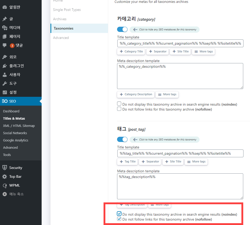 SEOPress 플러그인에서는 워드프레스 알림판 > SEO > Titles & Metas > Taxonomies에서 태그 옵션 아래의 두 항목을 선택하면 noindex와 nofollow 메타태그가 태그 분류 페이지에 추가됩니다.