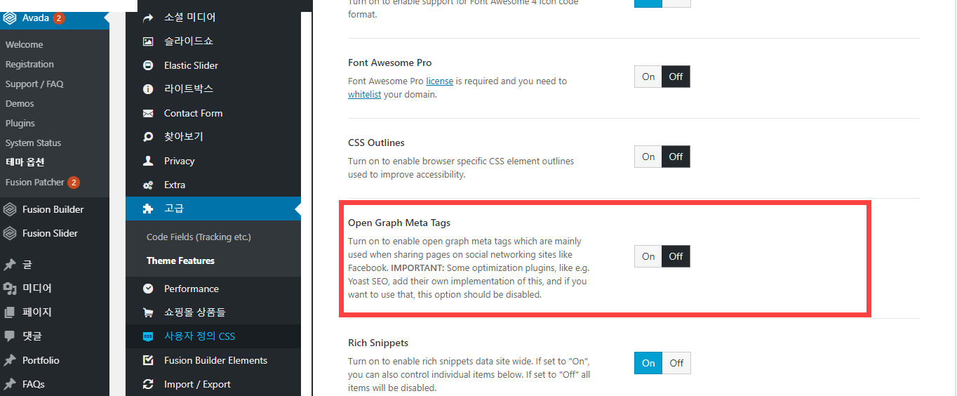 아바다 테마의 오픈 그래프 메타 태그 기능을 비활성화하려면 워드프레스 알림판 > Avada > 테마 옵션 > 고급 > Theme Features (테마 기능)로 이동한 다음 Open Graph Meta Tags (오픈 그래프 메타 태그) 옵션을 찾도록 합니다.