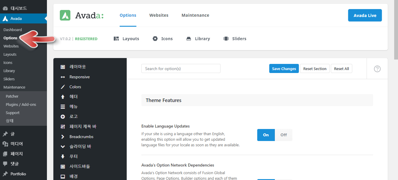 ※참고: 아바다 버전 7에서는 인터페이스가 바뀌었습니다. 테마 옵션 (Theme Options)가 옵션 (Options)으로 바뀌었습니다. 아래는 버전 7.0.2의 UI일 때를 보여줍니다.