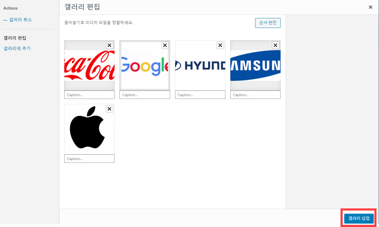 그러면 갤러리 편집 화면이 표시됩니다. 끌어놓기로 이미지 파일을 정렬할 수 있습니다. 적절히 갤러리를 편집한 후에 "갤러리 삽입"을 클릭합니다.