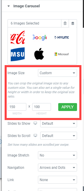 Custom을 선택할 경우 이미지의 가로 및 세로 폭을 지정합니다. 가로 세로 크기를 지정한 후에 APPLY (적용)를 클릭합니다.