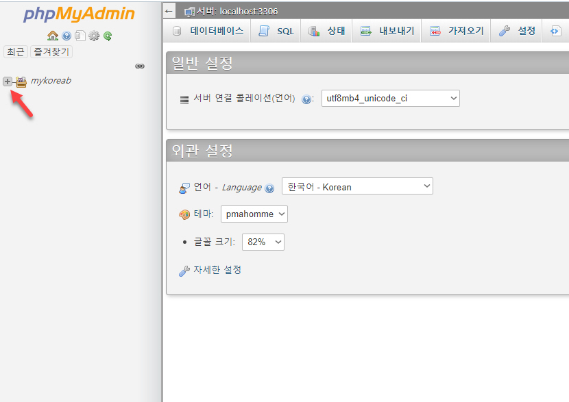 다른 방법으로 오른쪽의 cPanel에서 Databases > phpMyAdmin 아이콘을 클릭하여 phpMyAdmin 툴에 액세스할 수 있습니다. 두 방법 중에서 아무 방법을 이용하면 됩니다.