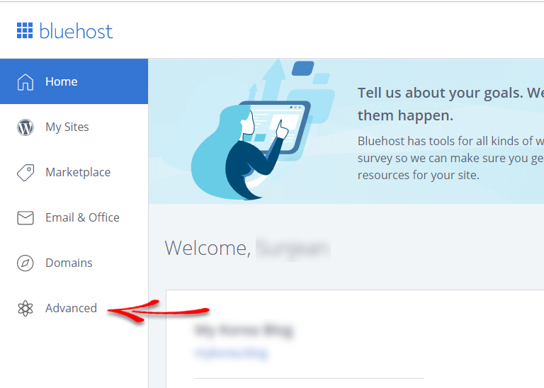 구 버전의 경우 블루호스트에 로그인한 다음, 왼쪽 패널에서 Advanced 탭을 클릭합니다.