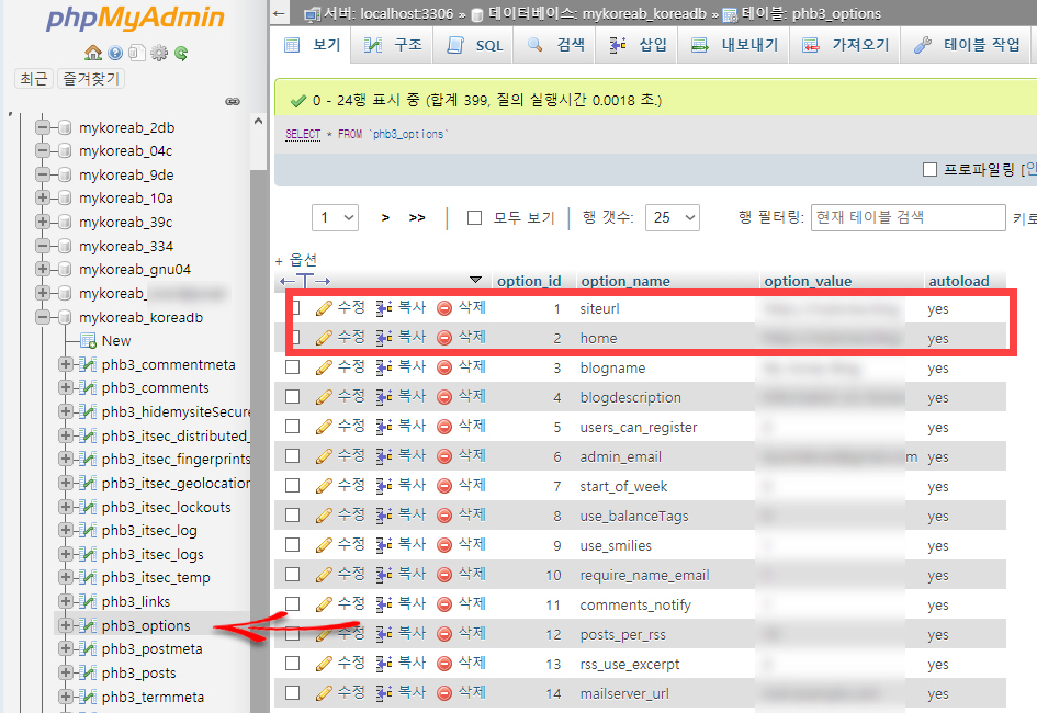 이 방법도 귀찮다면 phpMyAdmin에서 각 DB 이름을 클릭하여 사이트 URL을 확인하는 방법도 있습니다. 워드프레스의 경우 wp_options 아래의 siteurl과 home 필드에서 사이트 주소를 확인할 수 있습니다.