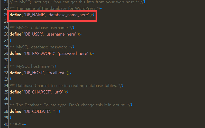 wp-config.php 파일을 열고 DB_NAME 부분으로 이동하여 DB 이름을 확인할 수 있습니다. 'database_name_here' 부분에 있는 것이 DB 이름이 됩니다.