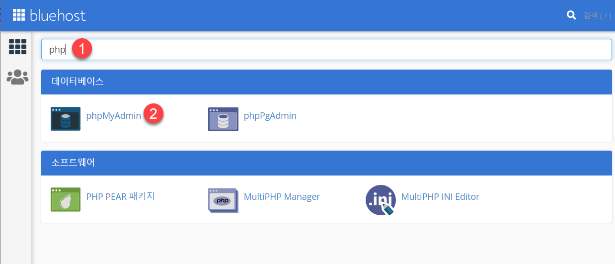 cPanel에 로그인하면 php로 검색한 다음, phpMyAdmin 툴을 선택합니다.
