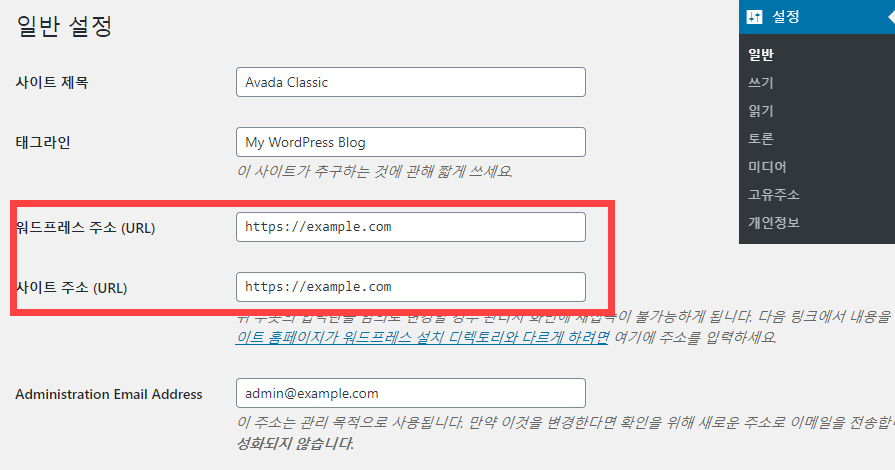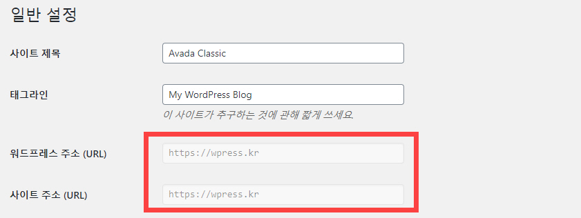 위의 두 라인을 변경하고 wp-config.php 파일을 저장한 후에 워드프레스 관리자 페이지에 접속하여 주소를 확인해보면 주소가 바뀌어 있음을 확인할 수 있을 것입니다. 마찬가지로 바뀐 주소는 관리자 페이지 내에서 수정할 수 없습니다.