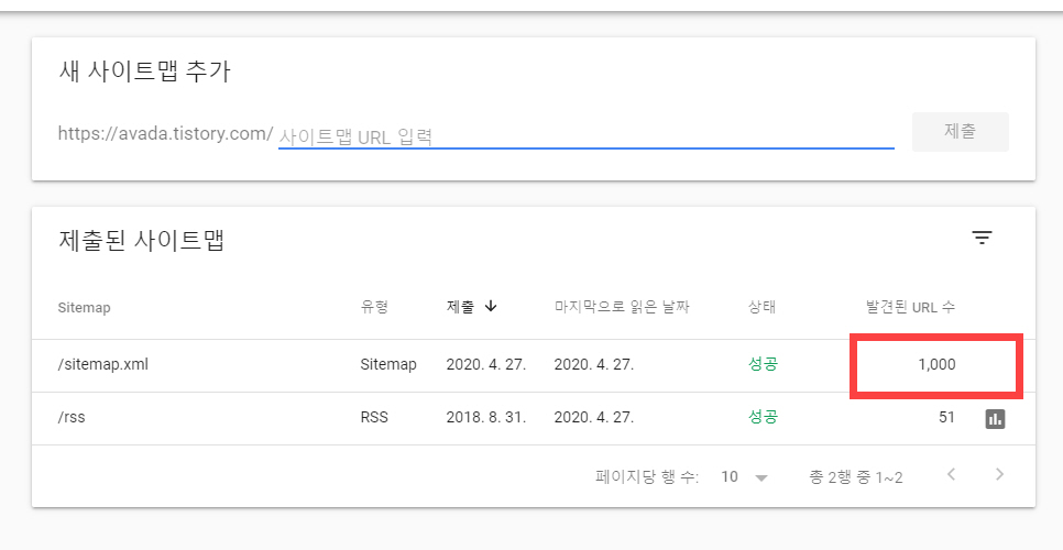 글 개수가 1000개가 넘는 블로그를 운영하는 경우 이 점은 다소 아쉽네요. 글을 계속 발행하면 사이트맵에서 누락되는 항목이 증가할 것 같습니다. 이 부분이 SEO에 어떻게 작용할지 모르겠습니다. 네이버에는 사이트맵을 하나만 제출 가능하므로 어떻게 할 수 없지만, 구글에는 기존에 만들어 놓은 사이트맵을 다시 제출해야 할지 고민이 되네요.