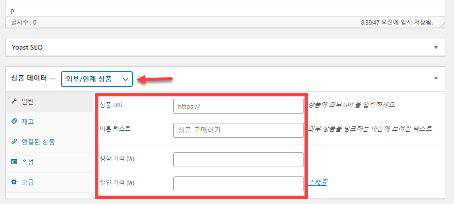 외부 상품을 등록하려면 상품 편집 페이지 하단에서 상품 데이터를 외부/연계 상품으로 지정하면 됩니다.