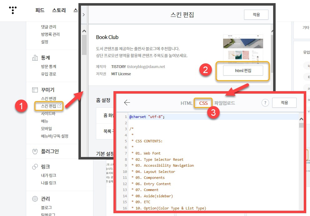 텍스트의 일부를 돋보이게 하고 싶은 경우 위에서 설명한 내용을 참고하여 형광펜 효과를 줄 수 있을 것입니다. 티스토리에서는 꾸미기 > 스킨편집 > html편집 > CSS 탭을 클릭하여 맨 아래에 추가할 수 있습니다.