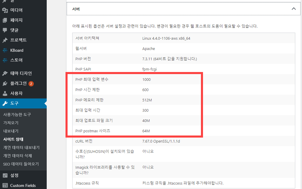 재부팅한 후에 워드프레스 관리자 페이지 > 도구 > 사이트 상태 메뉴로 이동하여 상태 탭을 클릭하면 서버 항목에서 PHP 변수값을 확인할 수 있습니다.