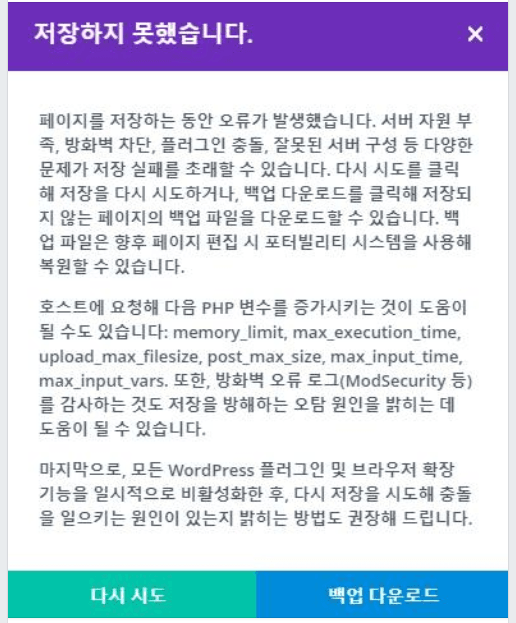 아마존 라이트세일에서 워드프레스를 운영하는 경우 기본 PHP 변수가 낮을 수 있습니다. 그러면 예상치 못한 문제가 발생하기도 합니다. 가령, 위의 그림에서와 같이 Divi 빌더로 편집한 후에 저장할 때 오류가 발생하기도 합니다. 그런 경우 php.ini 파일에서 PHP 설정값을 높여주면 문제가 해결될 수 있습니다.