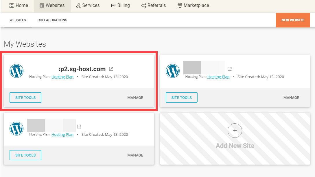 사이트그라운드 (SiteGround)에 로그인한 다음 Websites 메뉴를 클릭하면 현재 설치된 사이트 리스트가 표시됩니다.