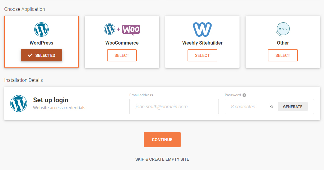 워드프레스를 설치하려면 WordPress 또는 WordPress + WooCommerce를 선택합니다. 이외에 Weebly Sitebuilder와 Other (기타)를 선택할 수 있습니다. Other를 선택하면 드루팔 등 다양한 어플리케이션을 선택할 수 있습니다.