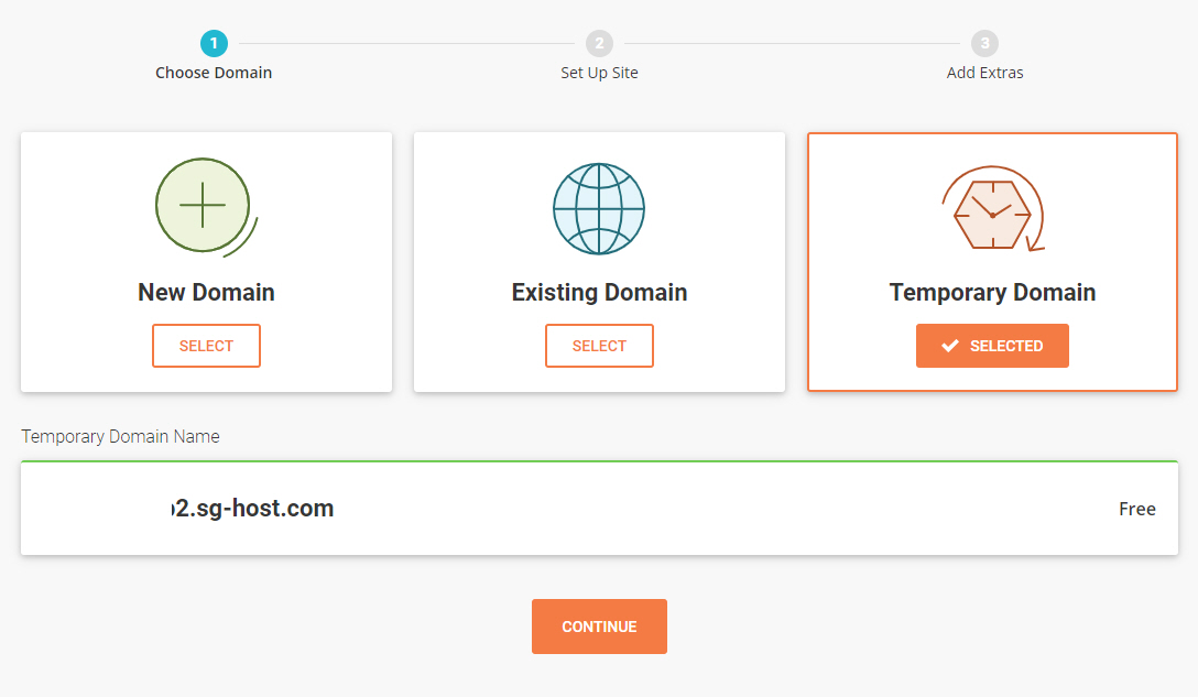 New Domain (신규 도메인), Existing Domain (기존 도메인), Temporary Domain (임시 도메인) 중에서 선택할 수 있습니다.