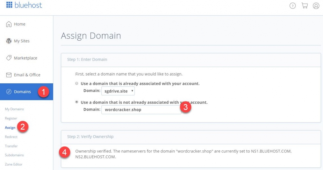 블루호스트에 로그인하고 Domains > Assign을 클릭합니다.