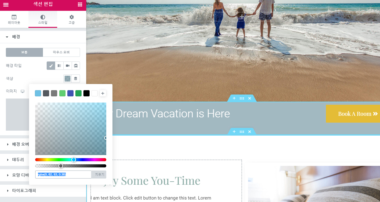 배경색에 투명도를 부여하려면 섹션 편집 창에서 스타일로 이동하여 배경 아래의 색상을 클릭한 다음 투명도를 지정하면 됩니다.