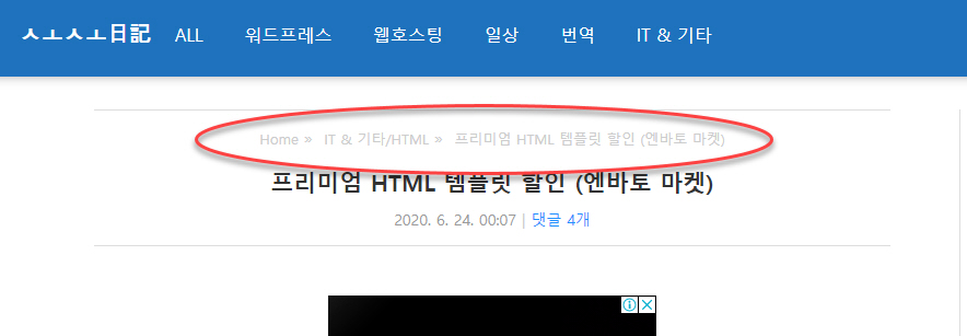 이제 저장하고 블로그 글을 살펴보면 다음 그림과 같이 브레드크럼(이동경로)이 표시될 것입니다.