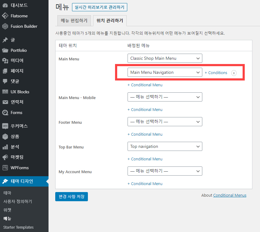 Conditional Menus를 활성화하면 테마 디자인 > 메뉴 > 메뉴 관리하기에서 테마의 메뉴 위치별로 조건을 부여하여 다른 메뉴를 표시하거나 표시하지 않도록 할 수 있습니다.