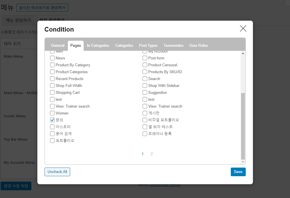 워드프레스 페이지에 따라 다른 메뉴 표시하는 방법