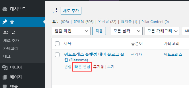 다시 댓글을 허용하려면 워드프레스 관리자 페이지에서 글 > 모든 글을 클릭하고 댓글을 허용할 글 위에 마우스를 올리도록 합니다. 그러면 숨겨져 있던 메뉴가 표시됩니다. 빠른 편집을 클릭합니다.