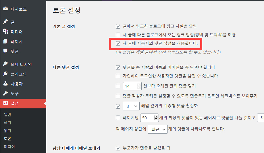 새로 발행하는 글에 대하여 댓글을 기본적으로 허용하거나 금지하려는 경우 워드프레스 대시보드에서 설정 > 토론으로 이동한 다음 기본 글 설정의 '새 글에 사용자의 댓글 작성을 허용합니다'를 체크하거나 체크를 해제하도록 합니다.