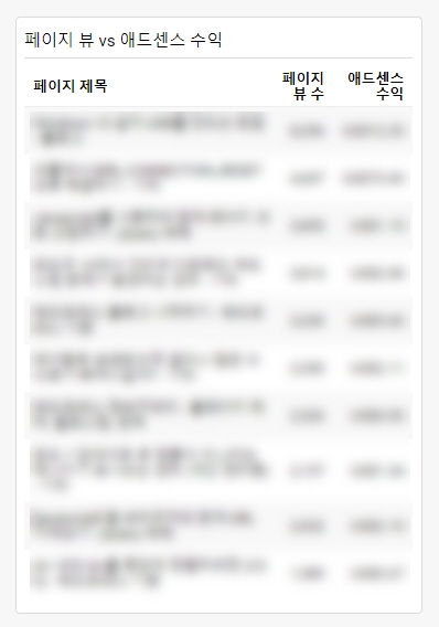 위에서 설명한 것과 다른 점은 다음 항목 표시 부분에서 페이지뷰 수가 추가된 것입니다. 저장을 누르면 다음 그림과 같이 페이지 뷰가 높은 상위 10개 페이지의 애드센스 수익이 표시됩니다.