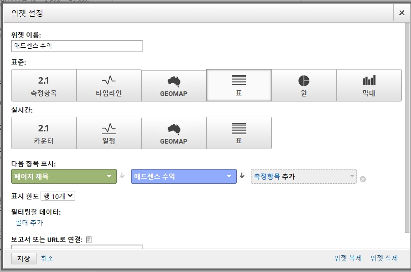 비슷한 방법으로 페이지 뷰가 높은 상위 10개 페이지의 애드센스 수익을 확인할 수 있습니다. 위젯 추가를 눌러 새 위젯을 생성합니다. 위젯 설정 팝업에서 다음과 비슷하게 설정합니다.