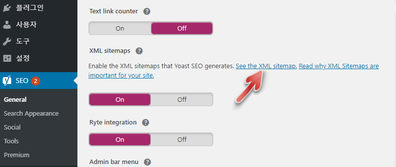 예를 들어, Yoast SEO에서 제공하는 XML 사이트맵을 활성화한 후에 사이트맵을 확인하려면 아래 그림에서 See the XML sitemap 링크를 클릭하면 됩니다.