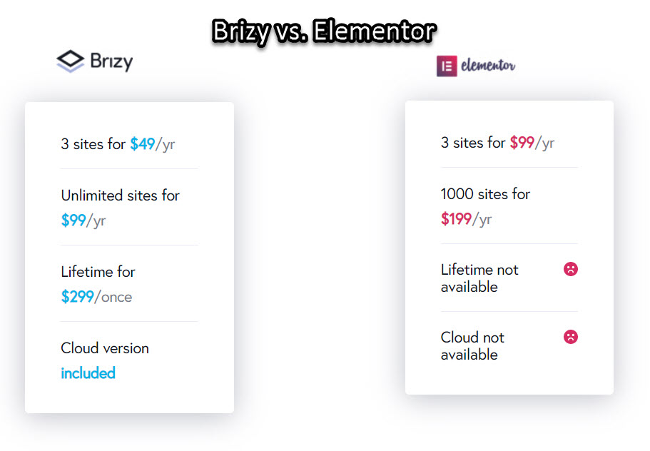 특히 Brizy는 평생 요금제(Lifetime Plan)도 제공하고 있으므로 연간 요금제를 제공하는 Elementor보다 가격면에서는 우위에 있습니다.