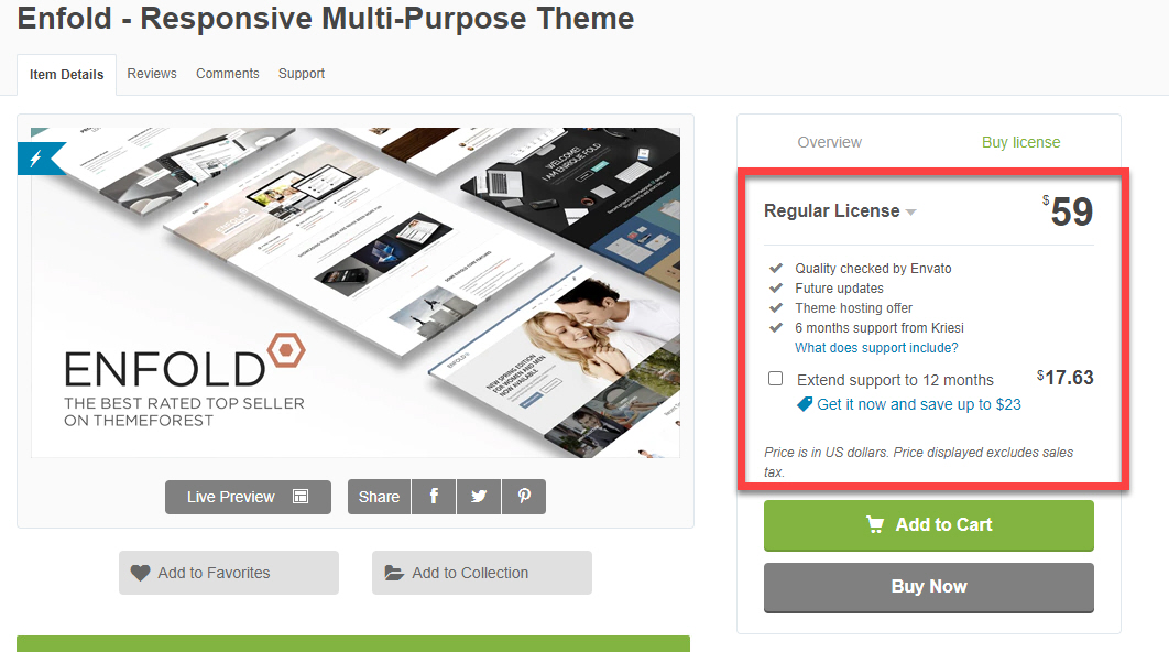 엔폴드 테마는 59달러에 판매되고 있으며, 여기에는 다음과 같은 항목이 포함됩니다. (다른 엔바토 마켓 테마에도 마찬가지 규정이 적용됩니다.)