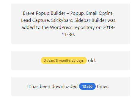 Brave Popup Builder는 강력하고 직관적인 워드프레스 팝업 플러그인입니다. 이 플러그인은 1000개가 넘는 워드프레스 사이트에 설치되어 사용되고 있습니다. 기능에 비해서는 그리 잘 알려져 있지 않은 편인데요, 작년 말에 처음 선을 보여 9개월 정도밖에 안 되어 아직은 사용자 수가 그리 많지 않습니다.