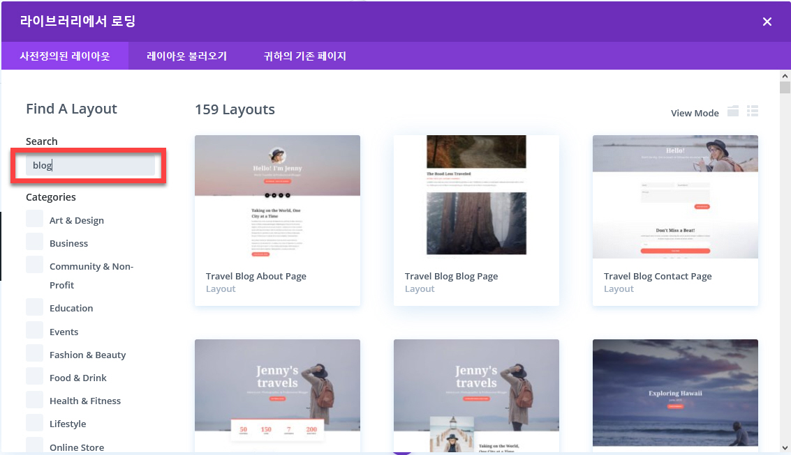 현재 1300개가 넘는 레이아웃을 이용할 수 있으며, 라이브러리에서 로딩 화면에서 Search 필드에 키워드로 검색하여 레이아웃을 찾아볼 수 있습니다. 예를 들어, 블로그 페이지를 만들려는 경우 blog로 검색해보면 159개의 레이아웃이 검색됩니다.